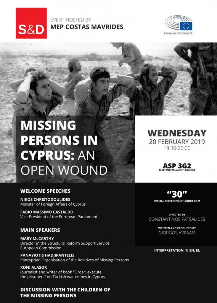 Χθές Τετάρτη 20 Φεβρουαρίου 2019 πραγματοποιήθηκε στο Ευρωκοινοβούλιο με πρωτοβουλία του Ευρωβουλευτή Κώστα Μαυρίδη εκδήλωση για τους Αγνοουμένους της Κύπρου με θέμα « Οι αγνοούμενοι της Κύπρου – μια ανοικτή πληγή».