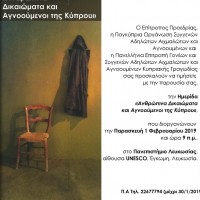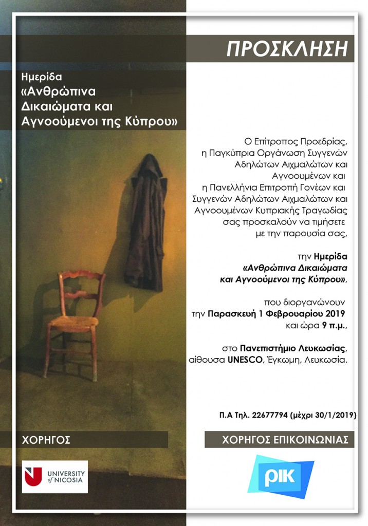 Ο Επίτροπος Προεδρίας, η Παγκύπρια Οργάνωση Συγγενών Αδηλώτων Αιχμαλώτων και Αγνοουμένων Κυπριακής Τραγωδίας σας προσκαλούν να τιμήσετε με την παρουσία σας, την Ημερίδα "Ανθρώπινα Δικαιώματα και Αγνοούμενοι της Κύπρου" που διοργανώνουν την Παρασκευή 1 Φεβρουαρίου 2019 και ώρα 9 π.μ., στο Πανεπιστήμιο Λευκωσίας, αίθουσα UNESCO, Έγκωμη, Λευκωσία. Π.Α. Τηλ. 22677794 (μέχρι 30/01/2019)